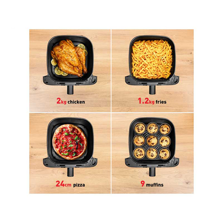 مشخصات فنی: عملکردها:سرخ کن، تعداد برنامه ها:۸ برنامه، برنامه هاسیب زمینی سرخ شده – استیک – مرغ سوخاری – پیتزا – میگو – ماهی – سبزیجات – دسر، ظرفیت به نفر:۸ نفر، جنس کاسه:روکش نچسب