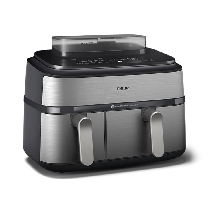 این طراحی دوقلو، امکان پخت همزمان دو غذای متفاوت را با تنظیم جداگانه فراهم میکند. در نتیجه میتوان هم غذا و هم پیشغذا یا دورچین را با یک دستگاه آماده کرد. سبد پخت بزرگ بهصورت متصل به دسته طراحی شده و در مخزن کوچک از سینی جداشونده استفاده شده است که هر دو با پوشش تفلون نچسب ارائه میشوند.