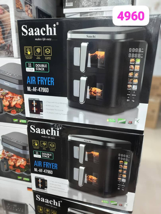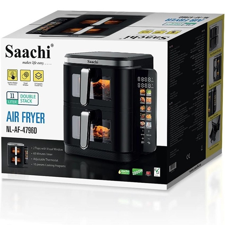 سرخ کن ۲ طبقه ساچی مدل ۴۷۹۶ با ظرفیت ۱۱ لیتر و قدرت ۲۸۰۰ وات با صفحه کنترل دیجیتال تمام تاچ تاشو دارای ۱۰ برنامه پخت اتوماتیک دارای ۲ المنت مجزا و دارای ۲ عدد فن مجزا با محفظه داخلی تمام استیل با کیفیت عالی و طراحی زیبا