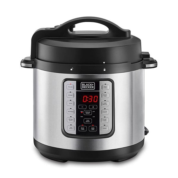 زودپز 6 لیتری بلک اند دکر مدل PCP1000-B5 به شما این امکان را می دهد تا از مزایای 7 وسیله پخت و پز مختلف همچون زودپز، آرام پز، پلوپز، بخارپز غذا، گرم کن غذا، ماست ساز و سوپ ساز را در یک دستگاه بهره ببرید. این زودپز هوشمند ظاهر زیبایی دارد و از جنس استیل ضد زنگ برش خورده ساخته شده که برای هر خانه ای مناسب است. دیگ آلومینیومی سبک وزن، دارای سطح نچسب است که موجب نظافت آسان تر آن می گردد. مولتی کوکر Black and Decker PCP 1000-B5 به تایمر 4 ساعته پخت با تاخیر نیز مجهز شده و از 20 ساعت زمان پخت نیز بهره می برد تا بتوانید وعده های غذایی خود را از قبل برنامه ریزی نمایید. همچنین عملکرد گرم نگه داشتن، دمای غذا را تا زمان سرو حفظ می کند. این دستگاه دارای 12 برنامه هوشمند لمسی همراه با صفحه نمایش LED دیجیتال است که به رفع نیازهای آشپزی دلخواه شما کمک شایانی می کند.