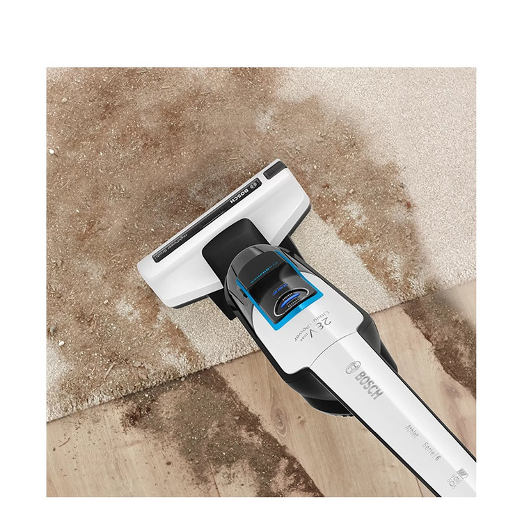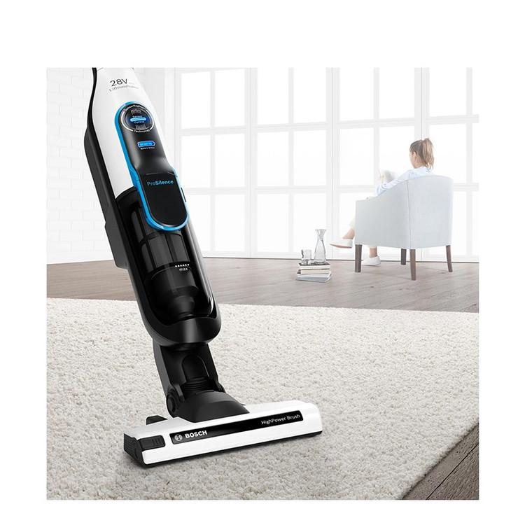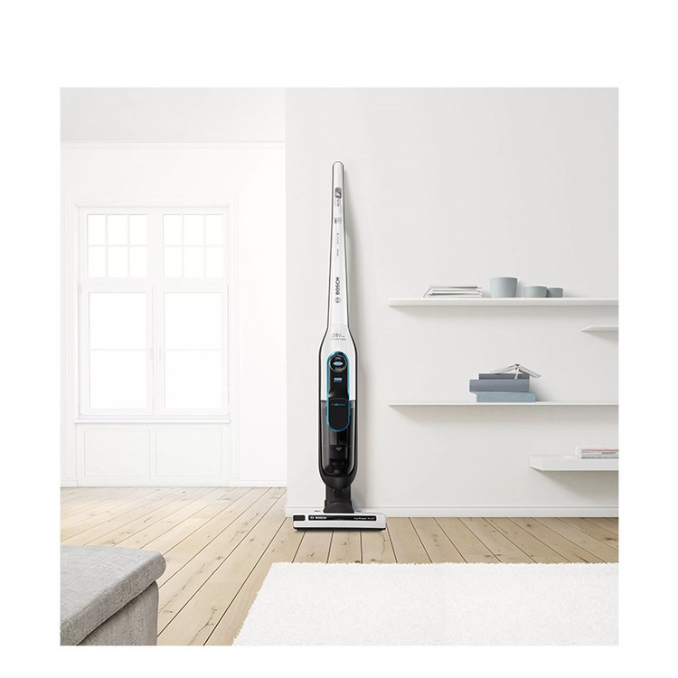 جارو شارژی بوش BOSCH مدل BCH86SIL1 دستگاهی با ظاهری زیبا به رنگ سفید و مشکی بوده که به صورت بدون سیم طراحی شده و موجب کارکرد بالا و بدون محدودیت در این جارو شارژی شده است. موتور دستگاه بسیار پر قدرت بوده و سبب طول عمر بالا به همراه بهترین عملکرد میشود. بدنه جارو شارژی بوش به صورت ارگونومیک و قابل انعطاف طراحی شده و میتوان به راحتی و بدون خم شدن ، فرش ، موکت ، پارکت و حتی نقاط دور از دسترس مانند زیر مبلمان را نظافت نمود. این دستگاه دارای 3 سطح مکش میباشد که متناسب با میزان کثیفی و نوع سطوح میتوانید میزان مکش را توسط کلید کشویی روی دسته تنظیم نمایید. داخل پارویی دستگاه یک برس مکانیکی AllFloor Highpower تعبیه شده که حدود 5000 دور در دقیقه کار میکند و موجب تمیزی ایده آل انواع سطوح از جمله پارکت و فرش میشود. باتری 28 ولتی جارو شارژی 6ATH25 از نوع LI-ION بوده که قابلیت استفاده مستمر تا 60 دقیقه را دارد و در مدت زمان 3 الی 6 ساعت به صورت کامل شارژ میشود. مخزن دستگاه نیز دارای ظرفیت 0.9 لیتر بوده که حجم زیادی گرد و غبار را در خود جای میدهد و در صورت پر شدن توسط نشانگر روی بدنه شما را مطلع میسازد. فیلتر بهداشتی دستگاه نیز برای خروج هوای پاکیزه تعبیه شده و در صورت کثیف شدن توسط هشدار دهنده LED روی بدنه زمان شستشوی فیلتر را اعلام می نماید.