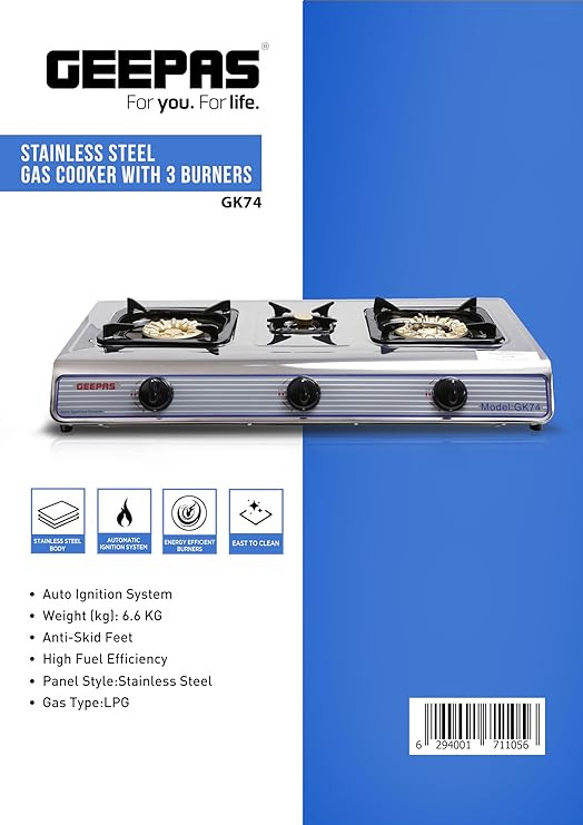 گاز سه شعله بادوام جیپاس مدل GK74 دارای بدنه استیل ضد زنگ می باشد. برای آشپزی سریع و بدون دردسر، این یک یک محصول ضروری در هر آشپزخانه است.این اجاق گاز کلاسیک و شیک به رنگ نقره ای جلوه آشپزخانه شما را زیباتر می کند. این اجاق گاز دارای سه مشعل برنجی ریختهگری با پایههای تابه آبکاری شده با کیفیت بالا و دستگیرههای کنترلی است تا شعله مورد نظر را برای آشپزی شما به راحتی تنظیم کند. مشعل های سنگین دارای تکیه گاه های تابه آبکاری شده برای قرار دادن ظروف بزرگ هستند. این اجاق گاز در مصرف گاز تا 60 درصد صرفه جویی می کند